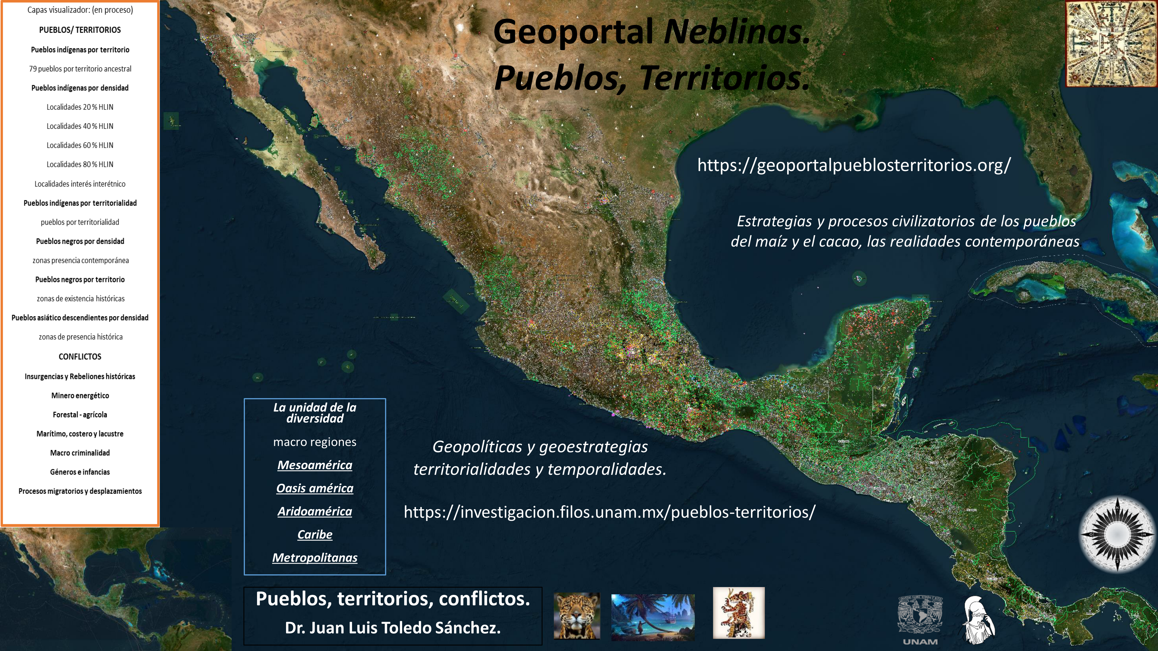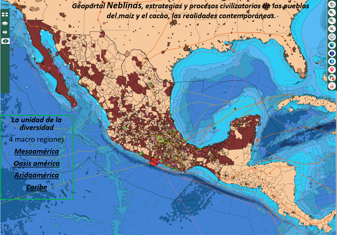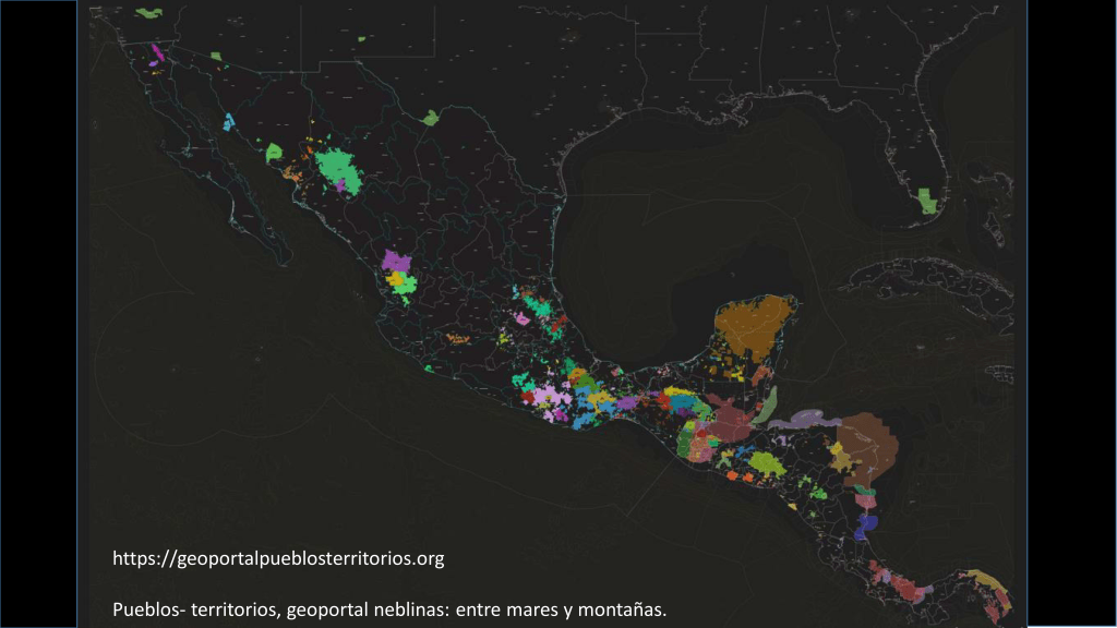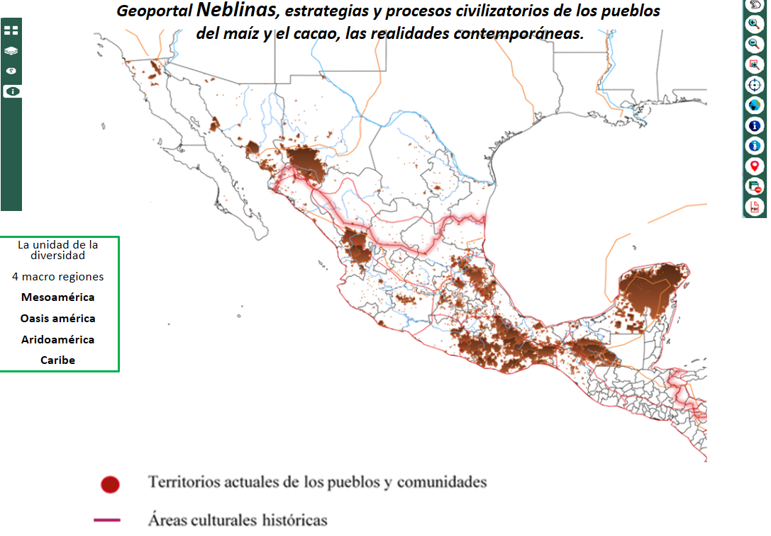 Geoportal de análisis territorial de los pueblos originarios en las regiones culturales donde actualmente se encuentra México, en la metáfora de las Neblinas, como presencias corpóreas a ras de tierra, temporales, humectantes y fértiles, con densidades y rumbos, como medio de relación de ciclos, tiempos y espacios, movimiento de partículas y combinaciones moleculares. Para sublimar las presencias de los pueblos indígenas, afrodescendientes y asiático descendientes que se presentan como importantes raíces y actualidades de los procesos de lucha, resistencia, espacios de poder contra hegemónico, de alternativas a las crisis civilizatorias y a las necropolíticas de un antropoceno hegemónico.