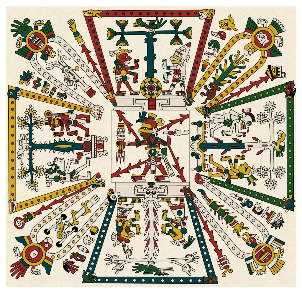 Primera página del Códice Fejervary- Mayer. Estructura del tiempo y el espacio. Pertenece al grupo denominado códices Borgia.