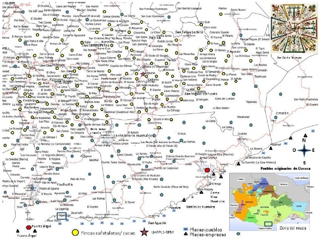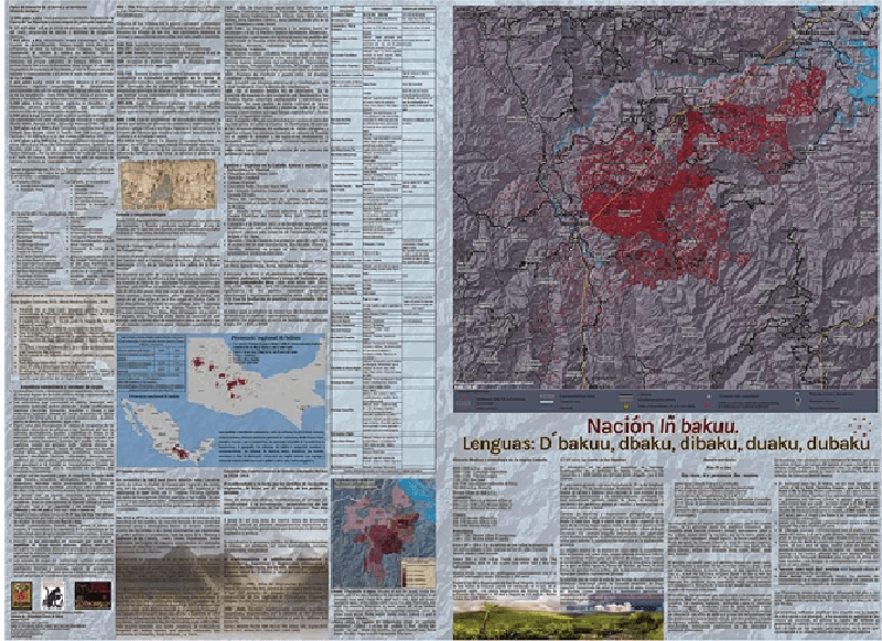 Cartografía de los pueblos de la Cañada de Oaxaca. Cartografía doble. Consta de 34 capas de información y 25 secciones en lengua Cuicateca. Es un mapa de dos vistas.
