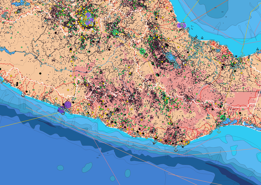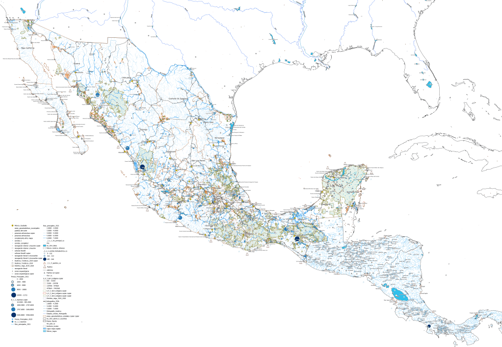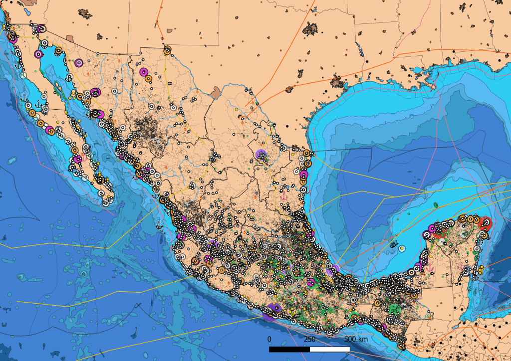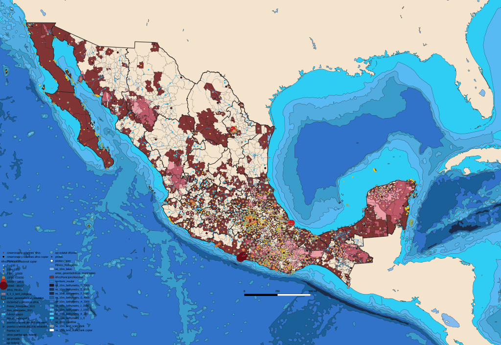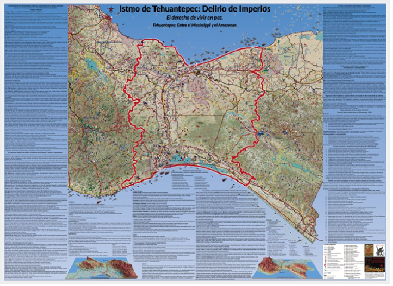 Cartografía histórica y contemporánea del Istmo de Tehuantepec. Consta de 106 capas y secciones de datos: pueblos, polígonos rurales, geolingüística, arqueología, historia antigua y reciente, proyectos transístmicos, interoceánicos, resistencias, centros urbanos, vías de comunicación, puertos, electricidad, gasoductos, megaproyectos, circuitos comerciales, petróleo, migración.